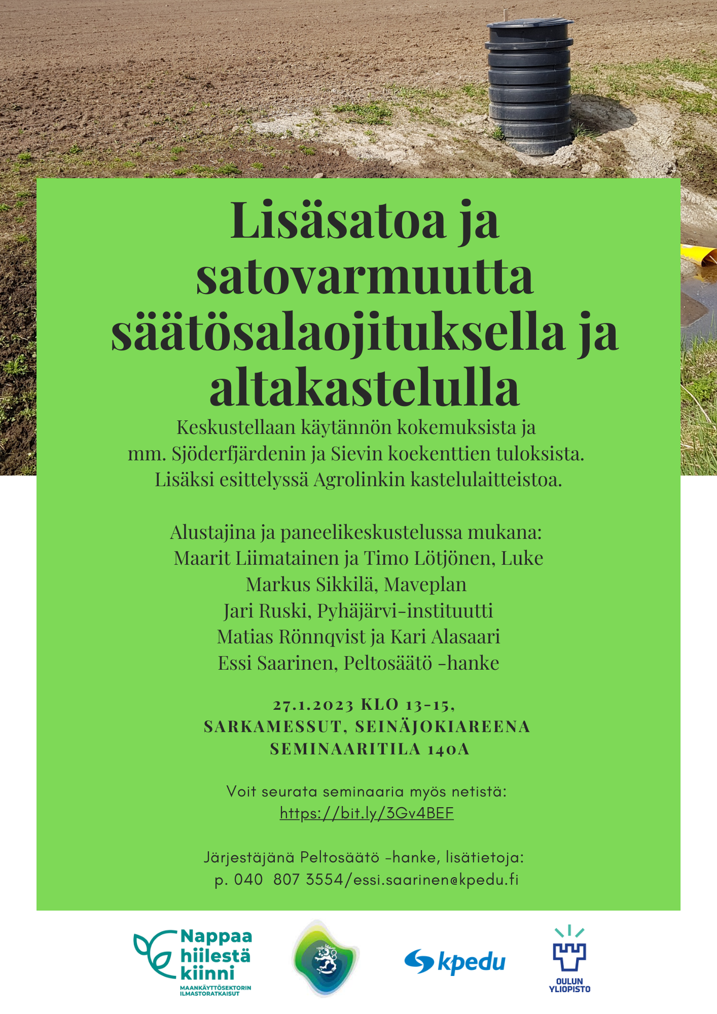Luke Ruukun NorPeat -tutkimuskentältä on jo lumet sulaneet ja viikonlopun aikana veden varastointiallas täyttyi ja nyt sulamisvesiä ohjataan altaan ohi jokeen, kertoi tutkimusaseman asiantuntija Jarkko Kekkonen. Haastateltavana oli myös tutkija Maarit Liimatainen, joka kertoi, että tulevana kesänä tutkimuskentällä päästään tekemään säätökastelua. Kasteltavaa alaa on 26 hehtaaria ja viljelykasvina ohra. Pohjaveden pinnan tavoitteeksi on ajateltu 50 cm maanpinnasta, mikä ei ole optimaalisin, jos halutaan vähentää kasvihuonekaasupäästöjä, mutta viljelykasvina oleva ohra ei kestä liikaa märkää. Tämän ensimmäisen kesän aikana päästään näkemään saavutetaanko 50cm:n pohjaveden korkeus myös kuivina jaksoina.