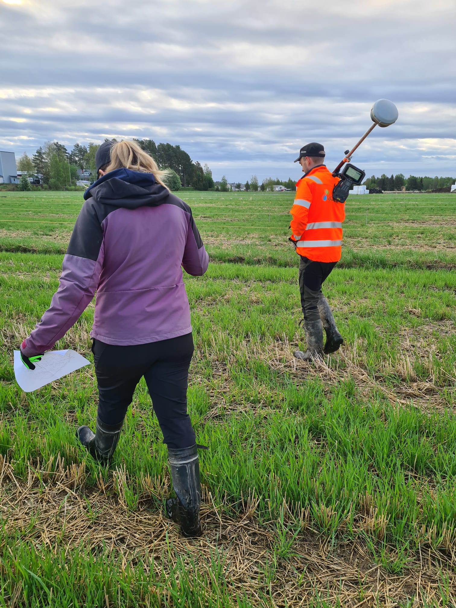 25.5 aamulla Markus Sikkilä Maveplanilta tuli paikallistamaan salaojien imuojat GPS:n avulla. Samalla saimme mittauspisteille tarkat merkit suoraan salaojakarttaan.